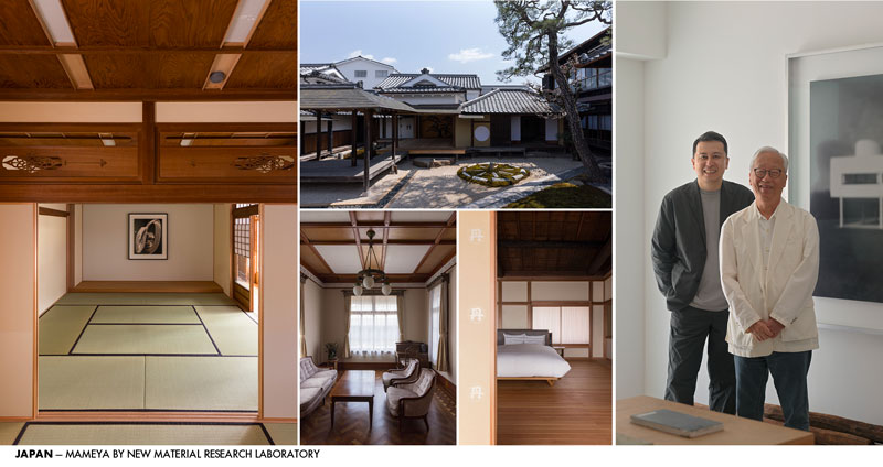 Hospitality. The ten buildings of Odagaki Shoten, constructed between the late Edo and early Taisho periods, were designated as Tangible Cultural Properties of Japan in 2007. In 2018, a restoration project led by the New Material Research Laboratory began to preserve the legacy of black soybean culture and revitalize the Tamba-Sasayama community. Completed in 2025, two buildings were transformed into Mameya, a private villa that combines traditional architecture with modern design. The renovation retains original wooden structures and incorporates serene gardens of black stones and moss, reflecting the essence of Japanese aesthetics. Interior details include calligraphy by Hiroshi Sugimoto and karakami paper sliding doors that filter soft light. Mameya offers guests an immersive stay where historical architecture, local culture, and contemporary art coexist in harmony. The renovation of this black soybean wholesaler, founded in 1734, draws inspiration from the refined elegance of Taisho-period merchant architecture, combining traditional wooden trusses with modern seismic reinforcements. The project, realized by the New Material Research Laboratory, revives this culturally significant building for contemporary use while preserving its historical identity and craftsmanship. www.mameya.odagaki.co.jp/our-story