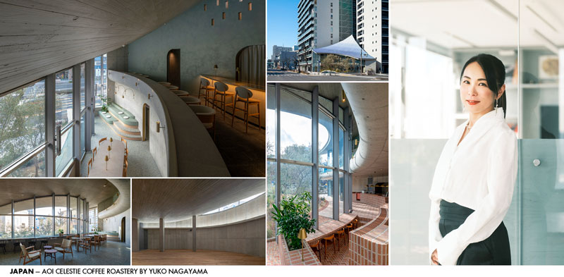 Hospitality. AOI Celestie Coffee Roastery is a three-storey café and roastery with an underground event hall, located at the corner of Nishiki-dori Street and Route 153 in Nagoya. Developed by a local logistics company as part of a community-revitalization effort, the building is organized around a central courtyard and defined by a distinctive roof that seems to have gently “fallen” between the surrounding high-rises. There is a boccia court in the basement that can also be used as multipurpose event space. The café spans the first and second floors, where recessed seating along the courtyard offers quiet views of olive trees. On the third floor, a bar tucked beneath the sweeping roof overlooks both the interior and the city. Clad in blue-gradient tiles from Tajimi, the roof reflects changing sky conditions, giving the project a light, airy presence. AOI Celestie emerges as a new urban landmark, an inviting cultural space in the heart of Nagoya. www.aoi-celestie.com