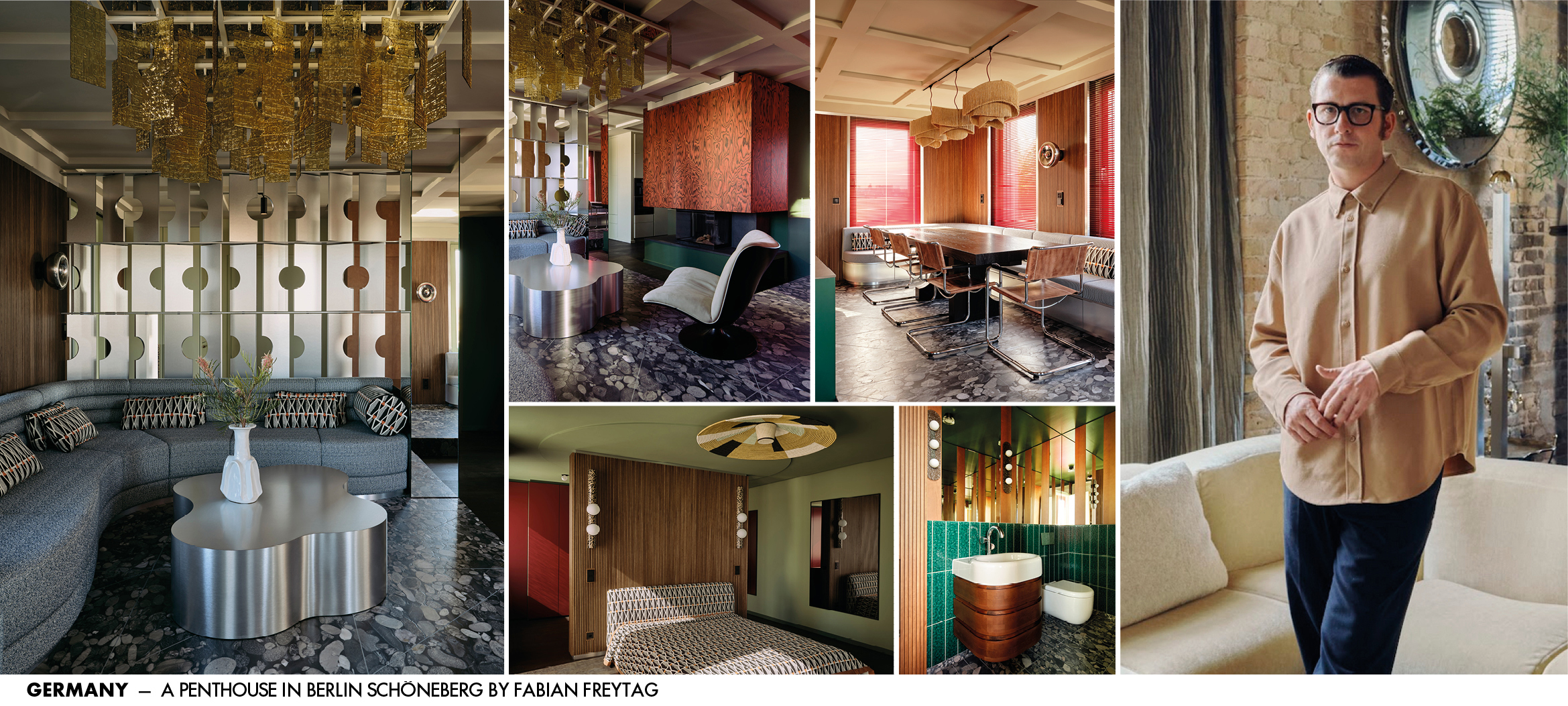 Private Home. What began as a simple refresh quickly evolved into a full remodel of a 175-square-meter penthouse in Berlin’s lively Schöneberg district. The homeowners asked German interior designer Fabian Freytag to reinterpret their space with the eclectic, artsy retro style they admired—especially after falling in love with a hotel in São Paulo. Freytag’s vision required a bolder transformation: new ceilings, wall finishes, built-ins, and a reworked floor plan. The most dramatic gesture is a raised black natural-stone platform in the living area, creating a two-level space that frames views of Nollendorfplatz and turns the lounge into a glamorous stage. To evoke a 1970s spirit, Freytag layered browns, jungle greens, lobster reds, warm walnut, golden melted glass, and graphic textiles. About 80% of the furniture is his own sculptural design, complemented by boho accents like raffia lamps, ceramic stools, and emerald tiles. “I wanted the space to feel elevated—like stepping into a film,” he says.