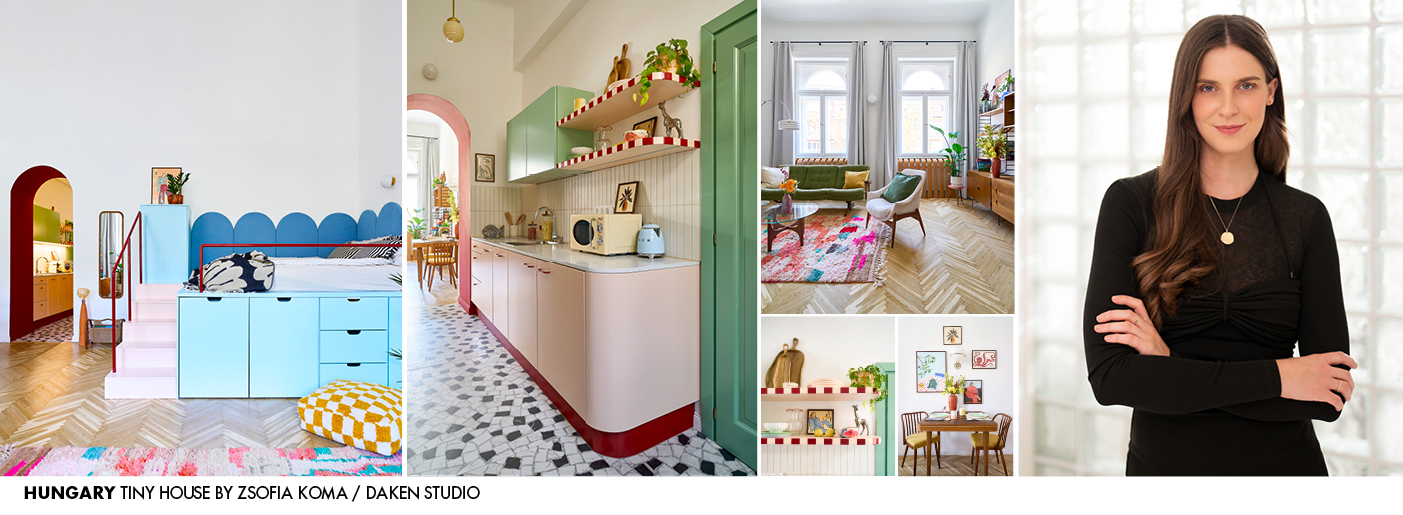 Private Home. This 41-square-metre guest apartment in Budapest was transformed from a run-down space into a bright, characterful interior built around colour, humour and sustainability. While the original layout was kept – with such a small footprint there was little room to relocate functions – a shadow-casting loft was removed to create airy, open and cheerful spaces with a strong sense of personality.