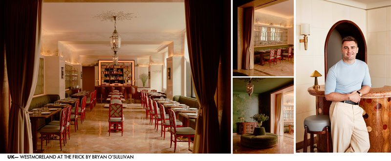 Café. Westmoreland is the first café established inside the storied Frick Collection on the Upper East Side of Manhattan, as part of Selldorf Architects’ renovation of that institution. Situated adjacent to Russell Page’s beloved garden, the Westmoreland’s design reflects the natural world through floral motifs on the bar surrounds, a palette of deep greens and soft pastels, and Darren Waterston’s breathtaking mural, which envelops the foyer and the frieze of the main dining space. Selldorf’s established palette of marble floors and walls is complemented by custom plaster mouldings and abstract chandelier medallions, from which Selldorf’s ‘Seguso’ pendants hang. Bryan O’Sullivan Studio’s design for the custom millwork of the bar and wait station reflect a contemporary take on the stylistic influences from the period during which the original Frick mansion was built. Custom furnishings subtly reference pieces from The Frick Collection itself, with bespoke dining chairs nodding to Elsie de Wolfe’s chinoiserie influence and a striking central borne in the foyer clad in green mohair, reminiscent of Hans Holbein’s Portrait of Sir Thomas More. www.frick.org/visit/cafe